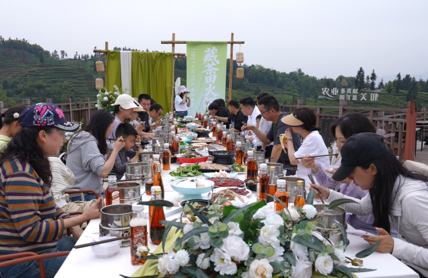 特色餐饮区飘出浓郁香气,藏茶火锅正式开锅——以雅安藏茶为汤底,加入本地腊肉、鲜笋、菌菇等食材,汤色红亮,茶香解腻。游客们一边涮菜一边录制视频:“藏茶煮火锅,我是第一次见,没想到这么搭!茶汤煮出来的肉特别嫩,还有淡淡回甘,这必须安利给我朋友们。”